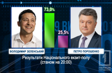 Согласно окончательным цифрам Национального экзит-пола, Владимир Зеленский набрал 73% голосов, а Пётр Порошенко – 25,5%. Ещё 1,5% опрошенных сообщили, что испортили бланк для голосования.
