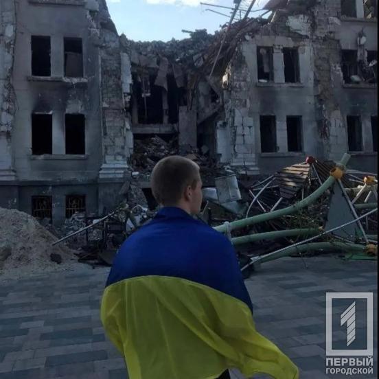 13. На площу розбомбленого росіянами Маріуполя вийшов молодик, обгорнути українським прапором – Маріупольська міськрада.