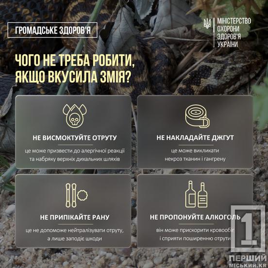 - Під час пікніків та прогулянок у парках обирати відкриті місця. Далі на зображеннях – поради, як діяти і чого робити точно не варто, якщо все ж змія вкусила. Будьте пильними та бережіть своє здоров'я!