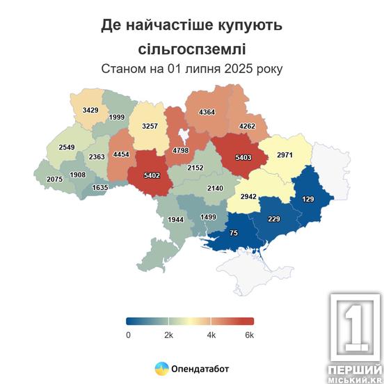 «Найнижчі ціни на землю у прифронтових регіонах: Запорізька область — 38,3 тис. грн/га, Херсонщина — 39,1 тис. грн/га, Чернігівщина — 41,1 тис. грн/га, Миколаївщина — 41,6 тис. грн/га та Одещина — 41,8 тис. грн/га. Цьогоріч найактивніше купують землі на Полтавщині (5,4 тисячі угод), Вінниччині (5,4 тис.) та Київщині (4,7 тисячі)», - розповіли аналітики.