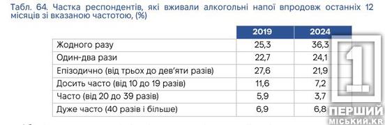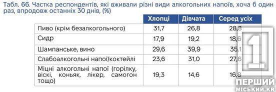 У підлітків 15–16 років зафіксували зниження рівня вживання алкоголю у порівнянні з попередніми роками. Експерти відзначили, що кількість опитаних, які жодного разу не вживали міцних напоїв зросла, а тих хто вживає епізодично чи часто – зменшилася. Водночас 14% підлітків залишаються у зоні ризику через надмірне споживання. Тут змін майже не відбулося. Дослідження також виявило, що раніше знайомляться з алкоголем дівчатка, вони ж і частіше випивають. Винятком є лише група опитаних із дуже частим вживанням.