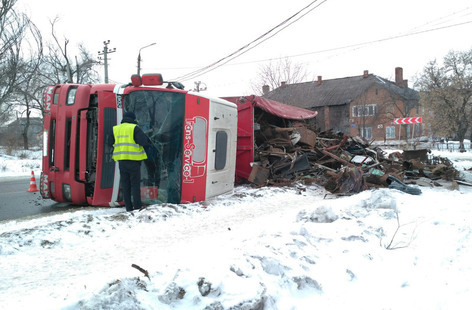 В Кривом Роге на скользкой дороге перевернулся грузовик с металлоломом