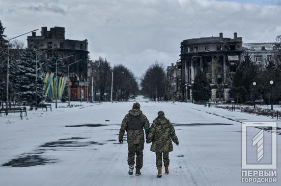 24. Украинские воины шагают по разрушенным улицам Бахмута, держась за руки в День влюбленных – Константин и Влада Либеровы.