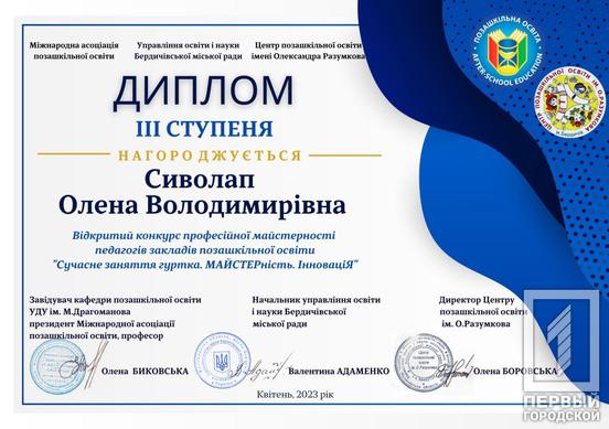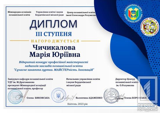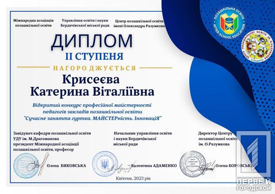 Дипломом II степени Международной ассоциации внешкольного образования, управления образования и науки Бердичевского городского совета, Центра внешкольного образования им. А.Разумкова наградили руководительницу кружка «Арт-студия» ПДЮТ Центрально-Городского района Екатерину Крисееву.