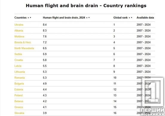 По данным платформы The Global Economy, которая использует индикаторы Fund for Peace, Украина получила 8,4 балла из 10 возможных: чем выше показатель, тем ощутимее количество населения и «мозгов» выезжает за границу. Это худший результат среди стран Европы.