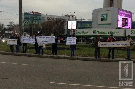 В центре площади, вдоль дороги стоят люди с плакатами против мэра Юрия Вилкула. Активисты не признают его назначение и требуют пересчета голосов.