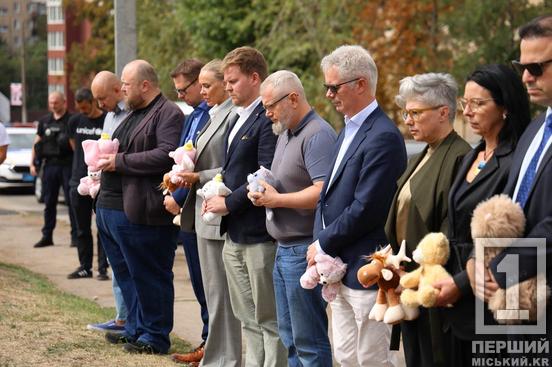 В ходе визита делегация почтила память погибших в результате ракетного удара 4 апреля 2025 года в Саксаганском районе. На этом месте Страна-агрессор убила 20 криворожан, среди которых 9 детей. Этот теракт - самый большой по количеству детских жертв с начала полномасштабной войны в Украине. Скорбная дата - навсегда в памяти и сердцах криворожан.