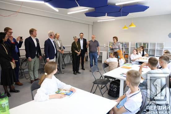 Далее гости вместе с главой Рады обороны города посетили школу №35. Одно из крупнейших учебных заведений города, пострадавшее от обстрела в апреле. При поддержке ЮНИСЕФ в заведении отремонтирована часть укрытия, проведены работы по замене поврежденных окон и дверей, созданы дополнительные учебные пространства.