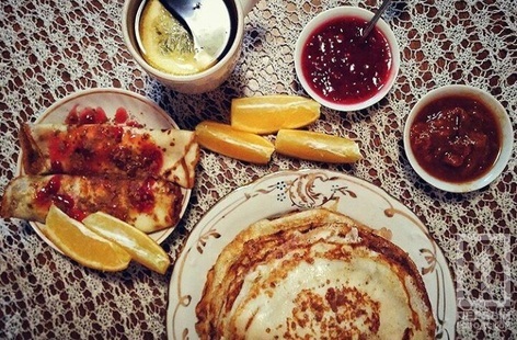 Разнообразие блинов поразило своим ассортиментом. Начинки были на любой вкус, напекли даже блины розового цвета. Горожане охотно лакомились угощениями и танцевали.