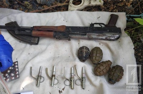Сотрудники полиции Кривого Рога совместно с СБУ обнаружили тайник. В нём они нашли сумку, в который было множество боеприпасов. А именно, автомат Калашникова, 59 патронов, четыре гранаты и запала. Также в нём нашли около 200 грамм конопли и конвалюты с таблетками.