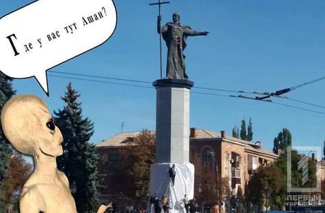 Криворожане оценили памятник Владимиру Великому. Люди стали создавать свои мемы на скульптуру, и гадать, куда на самом деле указывает перст крестителя Руси. Этот вопрос, видимо, волнует горожан больше всего. Также привлекает внимание криворожан светящийся крест.