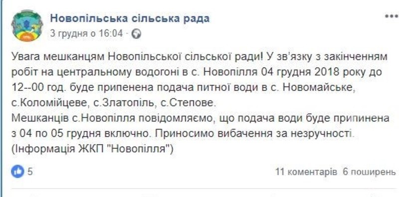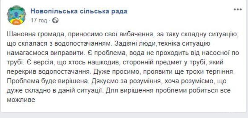 Утром 8 декабря жители села Новополье пикетировали насосную станцию из-за отсутствия в их домах воды. 4 декабря в сельсовете людям объявили, что будет замена водопровода, из-за этого отключат воду. Жители утверждают, что большие металлические трубы водопровода, которые, по их мнению, были в нормальном состоянии, вывезли ночью в неизвестном направлении. А менять собираются на маленького диаметра пластиковые. Сельсовет же на странице в соцсети сообщает об аварийных ситуациях и якобы перекрытии трубы неизвестным предметом.
