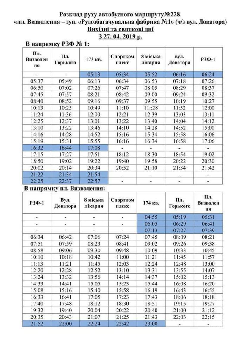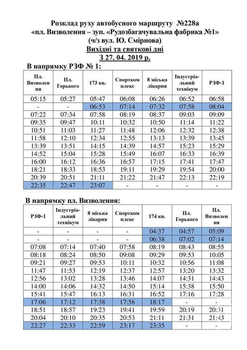 С 27 апреля в Кривом Роге ввели обновлённое расписание автобусных маршрутов №228 и 228А в выходные и праздничные дни. Транспорт соединяет площадь Освобождения и СевГОК. Это связано с включением дополнительных остановок за последние два года.