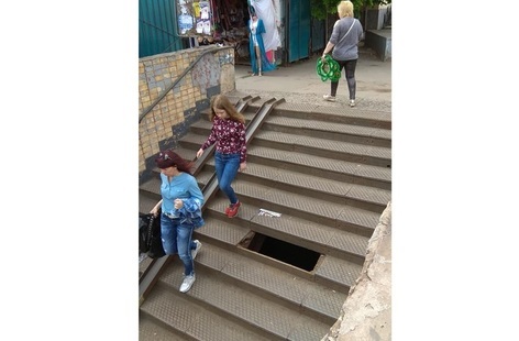 1 мая горожане заметили, что возле рынка на улице Лермонтова в подземном переходе пропал металлический фрагмент ступеньки. А на том месте образовалась дыра полтора метра глубиной. Это создавало угрозу для людей, особенно в тёмное время суток. Ширина дыры была около 70 см.
