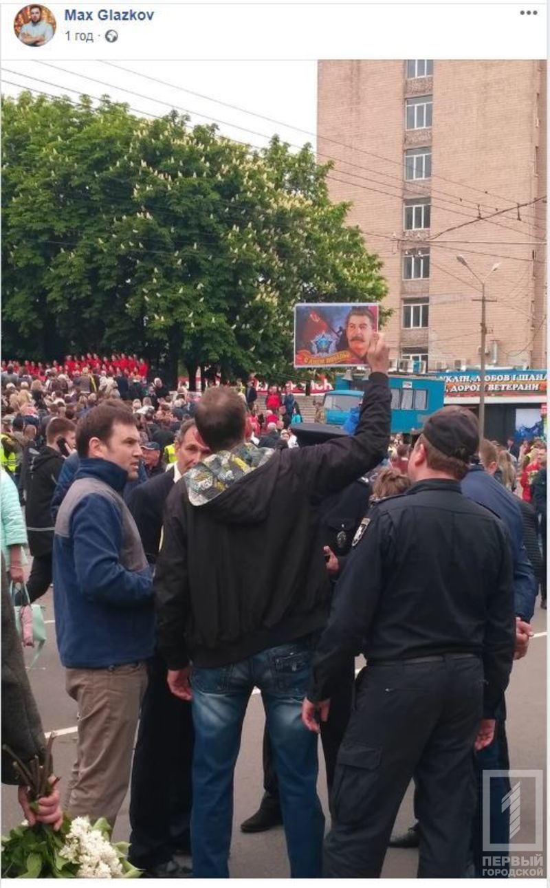 На празднование Дня победы в Саксаганском районе один из горожан принёс портрет Сталина. Он поднял его над головой и, не стесняясь, демонстрировал. Полицейские задержали мужчину.