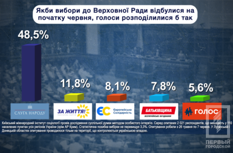 Если бы выборы прошли в начале июня за партию «Слуга народа» проголосовали бы 48,5% из опрошенных. За партию «Оппозиционная платформа “За Жизнь”» – 11,8%, за «Блок Петра Порошенко “Европейская Солидарность”» – 8,1%, «Всеукраинское объединение “Батькивщина”» – 7,8%, за партию «Голос» – 5,6%. Остальные политические объединения в опросе не набрали более 5%, которые нужны, чтобы пройти в Верховную Раду.
