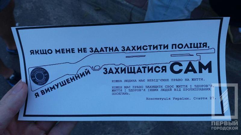 Люди пришли с чехлами, в которых обычно переносят оружие. На них были наклейки «Если меня не способна защитить полиция, я вынужден защищаться самостоятельно». Таким образом митингующие высказались за легализацию огнестрельного оружия в стране. Горожане также несли плакат, на котором раскритиковали работу министра Арсена Авакова.