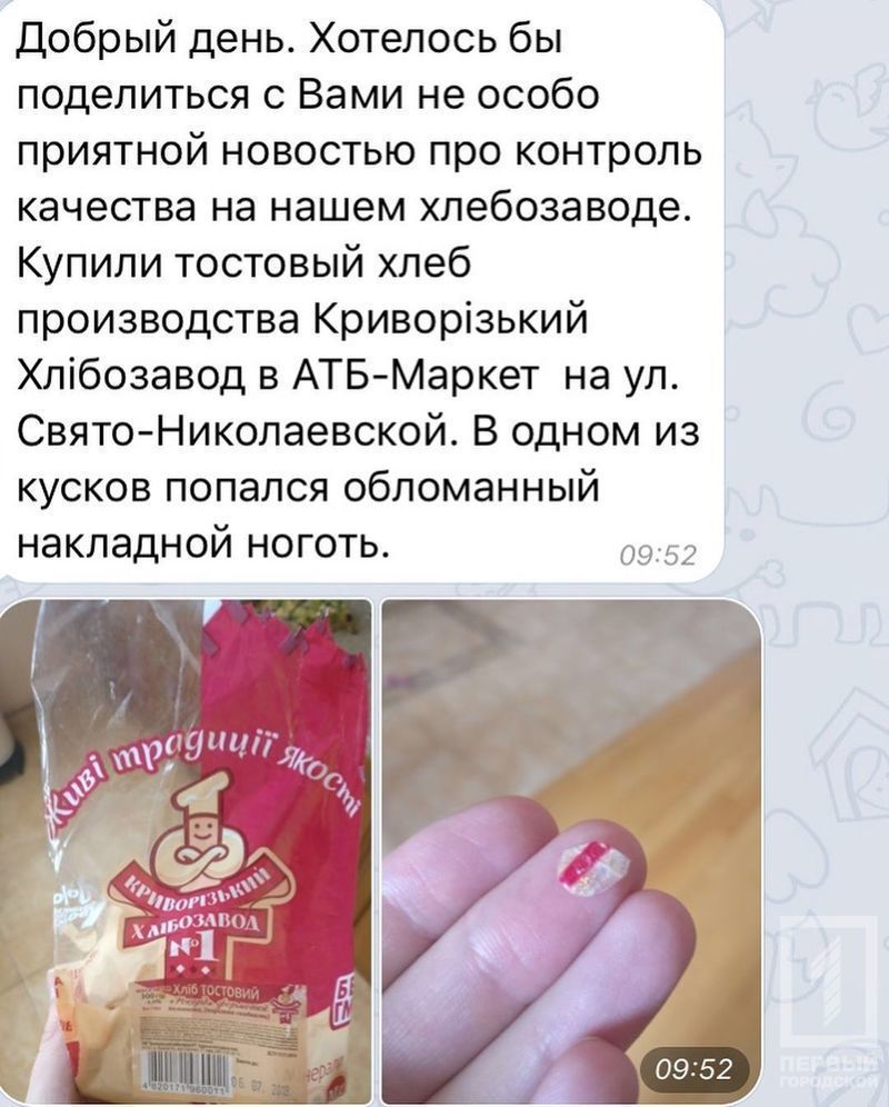 Фрагмент искусственного накладного ногтя нашли в тостовом хлебе производства местного хлебзавода, сообщают горожане. Буханку они купили в одном из супермаркетов на улице Свято-Николаевской.
