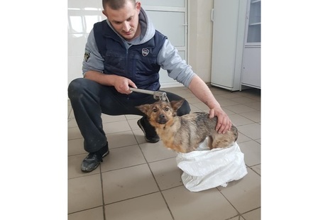 Собака попала в люк по улице Окружная. Помочь хвостатому приехали спасатели. С помощью кошмы и лестницы они вытащили животное из люка.