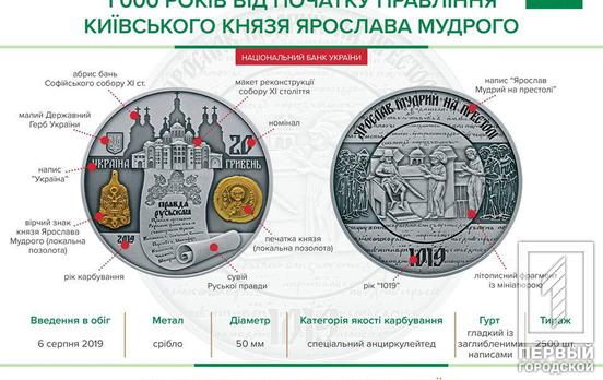Национальный банк 6 августа ввёл в оборот новую памятную монету номиналом 20 гривен. Она посвящена 1000-летию с начала правления князя Ярослава Мудрого. Монета изготовлена из серебра. Выпущена тиражом 2500 экземпляров.