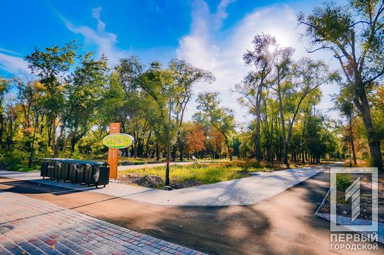 В парке заасфальтировали площадь у центрального входа и все велодорожки. Они связаны в одну единую сеть без тупиков и глухих углов. Вокруг детской площадки – самой большой, яркой и безопасной в городе, уже установили скамейки и урны, рабочим осталось соединить тротуарной плиткой игровую зону с пешеходными аллеями. Газоны в центральной части украсят декоративные разноцветные зонтики.