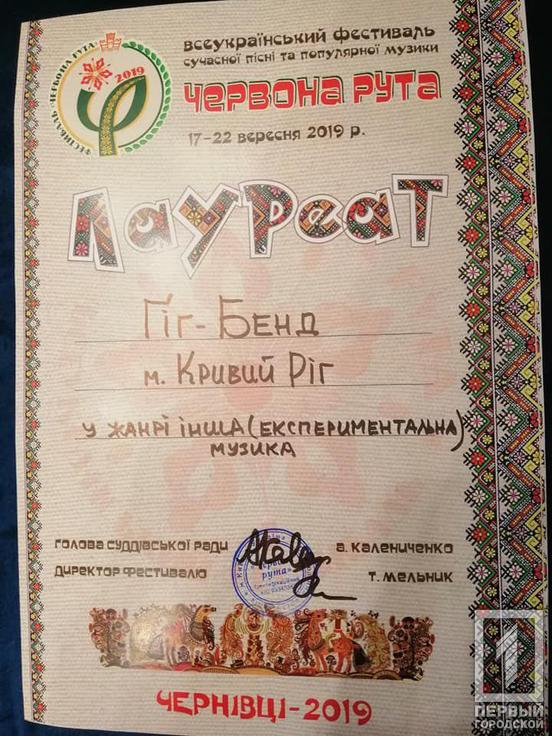 С 17 по 22 сентября в городе Черновцы проходил Всеукраинский фестиваль современной песни и популярной музыки «Червона рута. В одной из номинаций конкурса первое место завоевал криворожский коллектив «Гиг-Бенд». Об этом сообщила на странице в соцсети Наталия Журавель, преподаватель Дворца культуры «Саксагань».