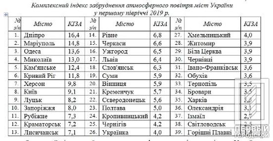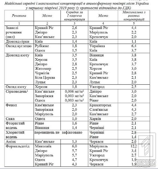 По итогам первого полугодия 2019 по комплексному индексу загрязнения атмосферного воздуха Кривой Рог среди всех городов оказался на шестом месте с показателем 11,8. На первом месте Днепр – 16, 4, на втором Мариуполь – 14,8, на третьем Одесса – 13,6. Самыми чистыми в этом плане оказались Измаил – 2,7, Светловодск – 2,5, Горишние Плавни – 1,4.