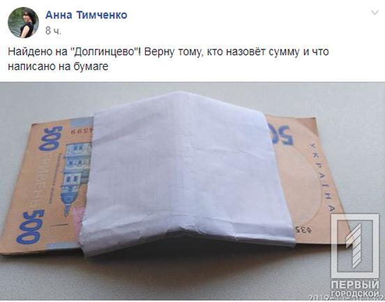 Анна Тимченко ищет того, кто потерял деньги с запиской в Долгинцевском районе. Тому, кто верно назовёт сумму, а также, что написано на клочке бумаги, женщина и вернёт деньги. Пост об этом горожанка опубликовала в соцсети.
