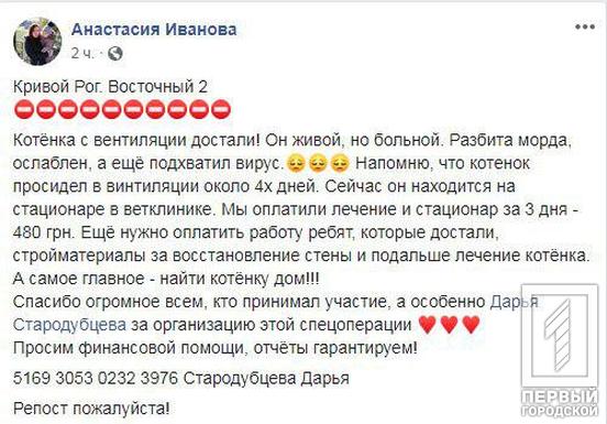 Через 12 часов в соцсети появился пост, но от лица Анастасии Ивановой. Она сообщила, что с котёнком всё в порядке, и он находится в ветклинике на лечении. Горожанам пришлось расколотить стену и достать хвостатого. У кота была разбита морда и ослаблен иммунитет. Сейчас котёнку ищут новый дом.