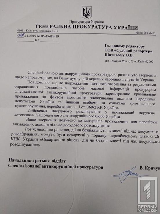 Специализированная антикоррупционная прокуратура начала расследование в отношении Юрия Корявченкова, Владимира Захарченко, Владлена Неклюдова, Юрия Киселя, Елены Криворучкиной. Основанием для этого стала публикация в СМИ аудиозаписей разговора людей, похожих по голосу на депутатов от «Слуги народа» и руководства полиции Кривого Рога. Об этом сообщила Страна.ЮА со ссылкой на запрос от Генпрокуратуры.