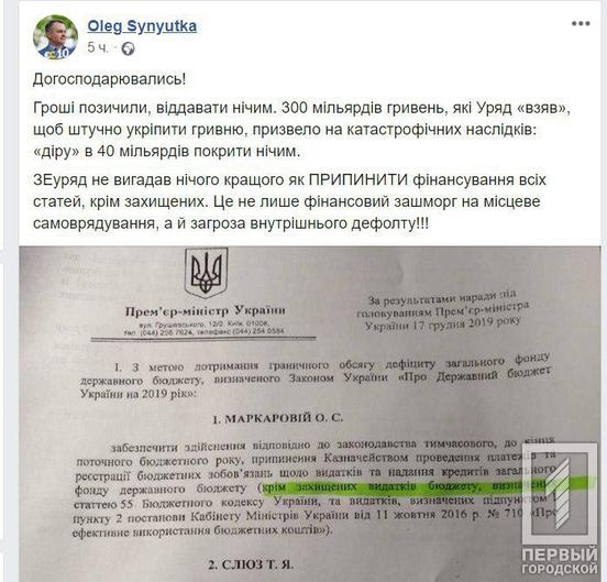 Нардеп Олег Синютка назвал такое решение Кабмина удавкой на шее местного самоуправления. По его мнению, такое произошло из-за того, что невозможно вернуть кредиты, которые брало правительство для укрепления гривны. А теперь из-за дыры в бюджете есть угроза дефолта.