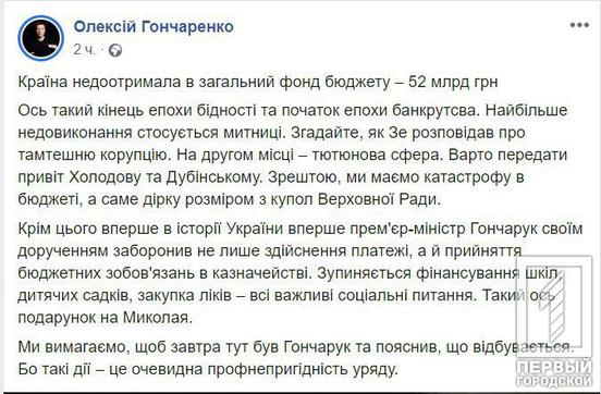 Нардеп Алексей Гончаренко в соцсети заявил, что такое скандальное решение правительства Гончарука – это показатель профнепригодности. Ведь впервые в истории страны запрещено не только осуществлять платежи, но и принимать Казначейству бюджетные обязательства.