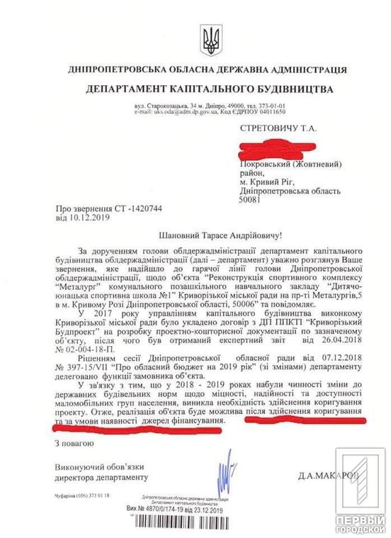 Тарас Стретович сообщил, что в конце 2019 года получил ответ на запрос, который отравил в ДнепрОГА. Чиновники написали ему, что проект реконструкции криворожского многострадального стадиона «Металлург» отклонил ГАСК (Государственный архитектурно-строительный контроль). Причина тому – несоответствие проекта государственным строительным нормам.