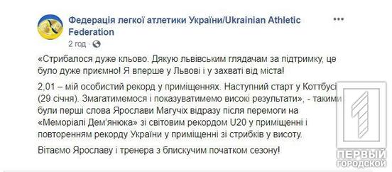 «Прыгалось очень клёво. Спасибо львовским зрителям за поддержку, это было очень приятно! Я впервые во Львове и в восторге от города! 2,01 – мой личный рекорд в помещениях. Следующий старт в городе Котбус 29 января. Будем соревноваться и показывать высокие результаты», – рассказала Ярослава сразу после победы в соревновании «Мемориал Демьянюка»