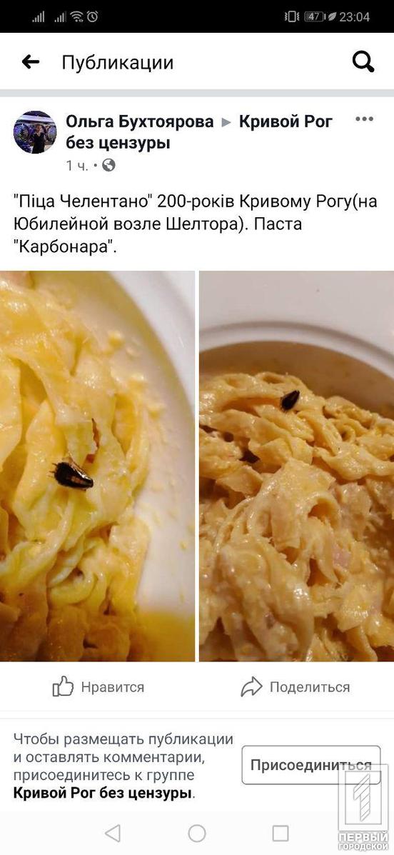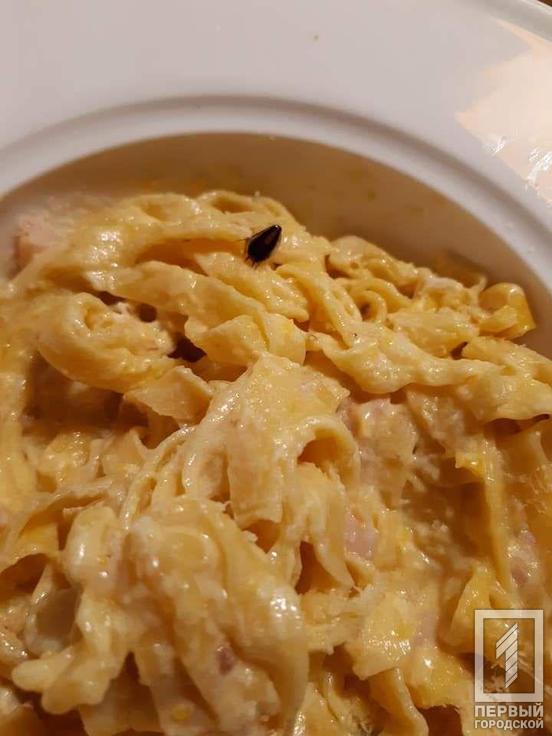 В соцсети появился пост с фотографиями, на которых запечатлели необычную подачу блюда с «изюминкой». В заказанной «Пасте Карбонара» посетительница обнаружила таракана. Такой бонус ждал в тарелке гостью заведения. Инцидент произошёл 23 января в одной из пиццерий расположенной на проспекте 200-летия Кривого Рога.