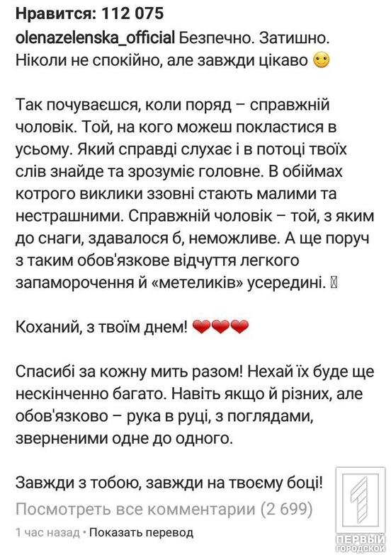 Немного позже появилось поздравление от людей, которые входят в близкое окружение Владимира Зеленского. Так, Елена Зеленская опубликовала трогательный пост в соцсети, поздравив своего мужа. «Безопасно. Уютно. Никогда не спокойно», - пишет Елена.