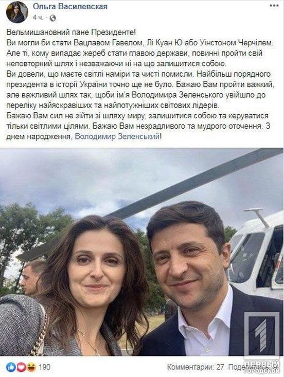 Журналистка и нардеп Ольга Василевская поздравила Президента и сообщила, что по её мнению, Владимир Зеленский мог бы стать Уинстоном Черчиллем, Ли Куан Ю и Вацлавом Гавелом.