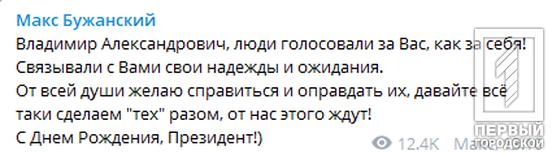 А вот депутат от «Слуги народа» Максим Бужанский вспомнил о дне рождения Президента в своём телеграм-канале. Он намекнул гаранту, что те, кого «обещали сделать вместе», все ещё ждут наказания. И Зеленский не может подвести тех, кто за него голосовал.