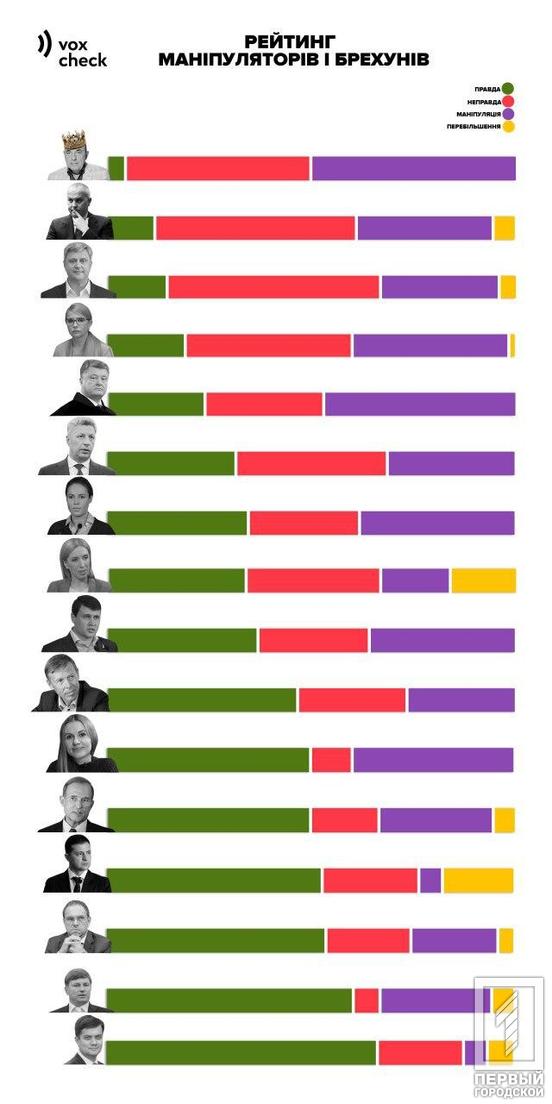 Наибольшим вруном и манипулятором, по мнению аналитиков, является Вадим Рабинович с 3,45% правды в своих меседжах и Нестор Шуфрич – 11,11% правды. Также тройку лидеров любителей неправдивой информации возглавил Александр Качный с 14,29% правды. Все трое – представители политической партии «Опозиционая платформа – За жизнь». 13 место заняла Юлия Тимошенко из партии «Батьківщина». Пятёрку, по мнению аналитиков, закрывает бывший Президент Украины Пётр Порошенко.