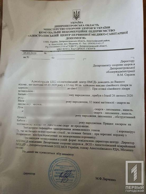 «Первому Городскому» стало известно, что отец семейства 26 февраля вернулся из Италии. На границе его якобы обследовали. У его беременной жены и троих детей диагностировали лихорадку и кашель. Всех больных, а также отца семейства и бабушку осмотрели врачи. О том, что у них выявили высокую температуру, а также, что их родственник недавно вернулся из Италии, информировали облздрав и гоздрав Кривого Рога.
