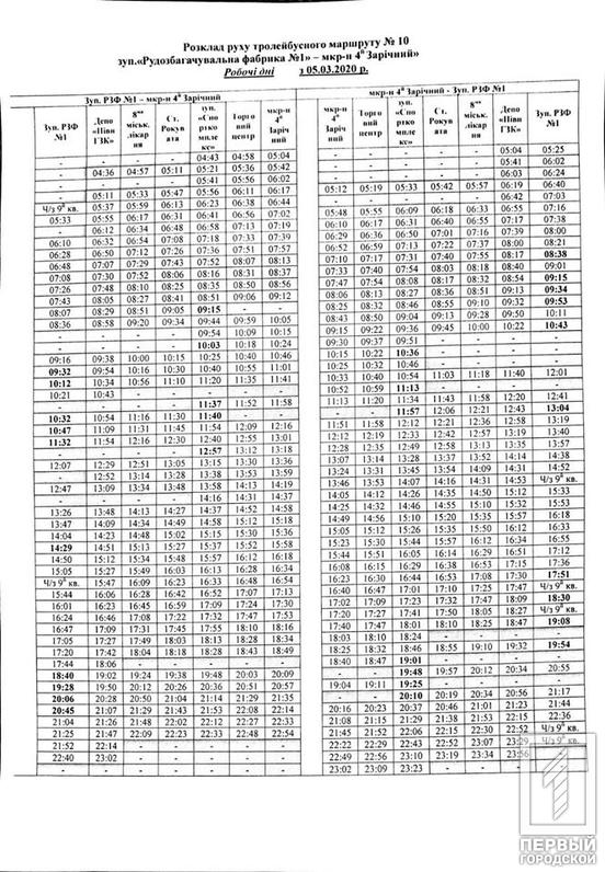 С 5 марта троллейбус №10 «Рудообогатительная фабрика №1 – микрорайон 4-й Заречный» будет курсировать по новому графику. Его опубликовали на странице отдел транспорта и связи исполкома Криворожского горсовета в соцсети.