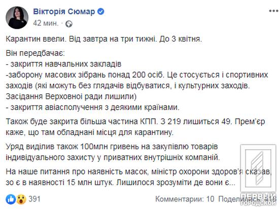 Нардепка сообщила о том, что в стране объявили общенациональный карантин. Он предусматривает: закрытие школ и садиков, запрет массовых собраний более 200 человек. Это касается и спортивных мероприятий (которые могут проходить без зрителей, и культурных мероприятий). Исключение – заседание Верховной Рады. Также закрывают авиасообщение с некоторыми странами.
