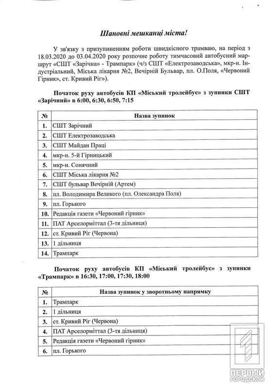 С 18 марта криворожский скоростной трамвай прекращает работу в связи с объявленным тотальным карантином. Ожидается, что это период продлится до 3 апреля. В это время возить пассажиров, ранее использовавших для перемещения по городу «подземку», будут при помощи автобусов. Они соединят станцию «Заречную» с «Трампарком». На пути следования всего будет 14 станций: «Заречный», «Электрозаводская», «Площадь труда», микрорайон 5-й Горняцкий, микрорайон Солнечный, «Городская больница №2», «бульвар Вечерний», площадь Владимира Великого (Александра Поля), площадь Горького, редакция газеты «Червоний гірник», АрселорМиттал («3 участок»), станция Кривой Рог (Червоная), «1 участок» и «Трампарк».