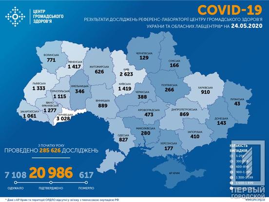 По состоянию на 9:00 24 мая в Украине зарегистрировали 20986 случаев заражения коронавирусом, из них 617 человек погибли, 7108 выздоровели. За минувшие сутки COVID-19 диагностировали у 406 человек, 12 пациентов скончались, а 179 побороли болезнь.