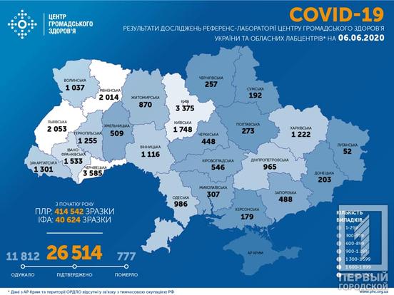 По состоянию на 9:00 6 июня в Украине нашли 26 514 случая заражения коронавирусом, из них 777 человек умерли, 11 812 выздоровели. За минувшие сутки COVID-19 диагностировали у 550 человек, 15 пациентов скончались, 440 вылечились.