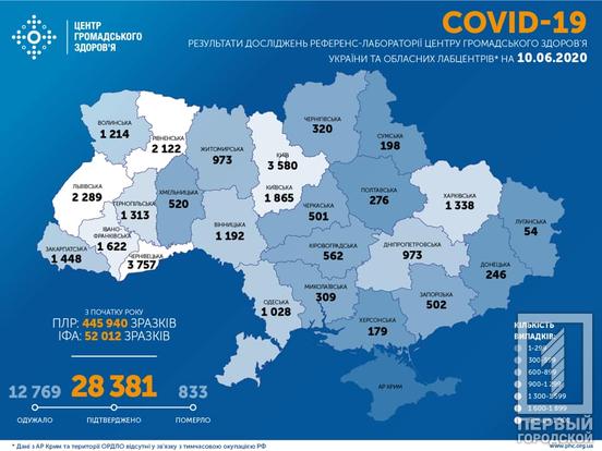 По состоянию на 9:00 10 июня в Украине диагностировали 28 381 случай заражения коронавирусом, из них 833 человека умерли, 12 769 выздоровели. За минувшие сутки COVID-19 диагностировали у 525 человек, 23 пациента скончались, 357 вылечились.