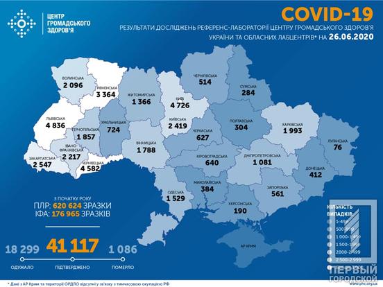 По состоянию на 9:00 26 июня в Украине зафиксировали 41 117 случаев заражения коронавирусом, из них 1 086 человек умерли, 18 299 выздоровели, 21 732 пациента продолжают болеть. За минувшие сутки COVID-19 обнаружили у 1109 человек (135 детей), 19 пациентов скончались, 541 вылечился.