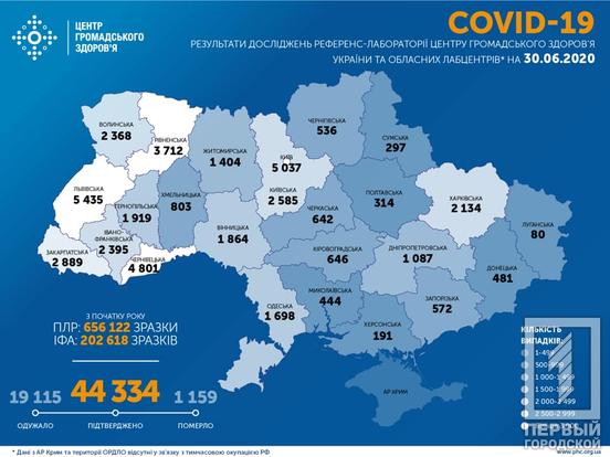 По состоянию на 9:00 30 июня в Украине зафиксировали 44 334 случаев заражения коронавирусом, из них 1 159 человек умерли, 19 115 выздоровели, 24 060 пациента продолжают болеть. За минувшие сутки COVID-19 нашли у 706 человек, 12 пациентов скончались, 88 вылечились.