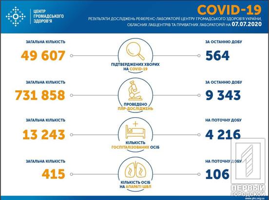 По состоянию на 9:00 7 июля в Украине зафиксировали 49 607 случаев заражения коронавирусом, из них 1283 человека умерли, 22 193 выздоровели. За минувшие сутки COVID-19 обнаружили у 564 человек, 21 пациент скончался, 490 вылечились.