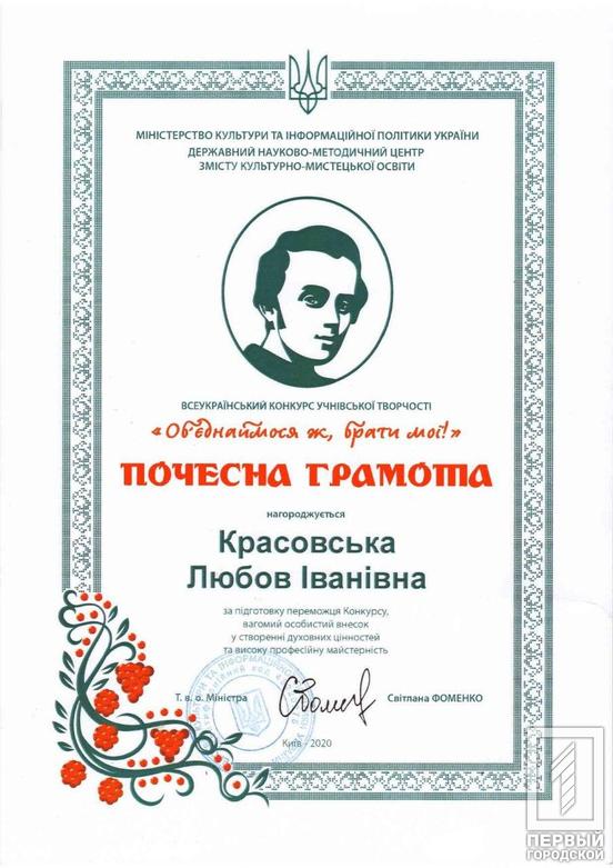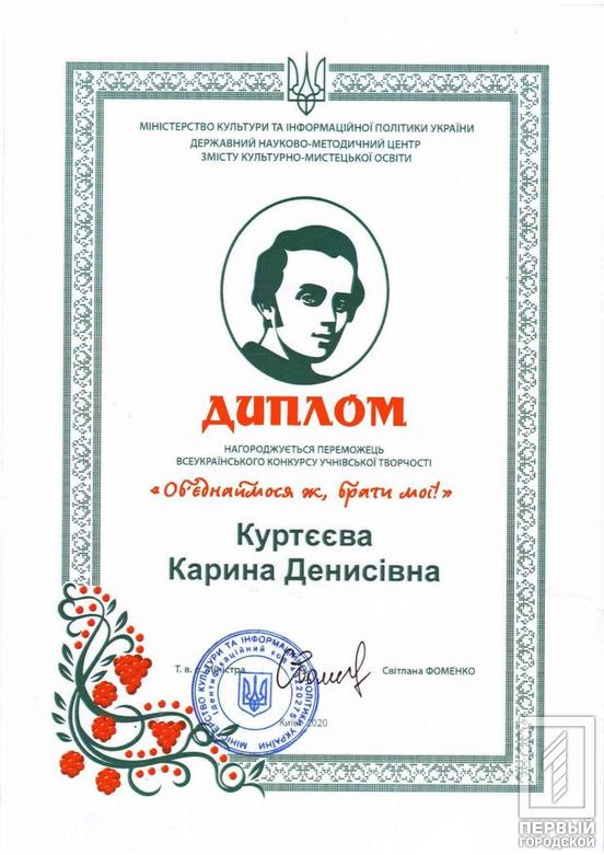 XІХ Всеукраинский конкурс ученического творчества, посвящённый Шевченковским дням, проходил под лозунгом «Объединимся же, братья мои». Первое место в номинации декоративно-прикладное искусство выборола ученица Криворожской городской школы искусств №1 Карина Куртеева. Талантливая девушка представила свою работу - вышивку «Цветущая Украина». Почётную грамоту также вручили и её учителю Любви Красовской.